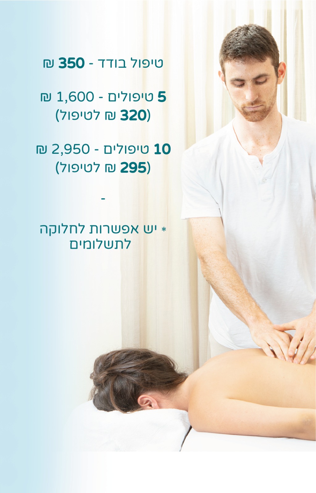 בכל טיפול אני מאבחן את המטופל, ומציע את הטיפול הרלוונטי ביותר למצבו. הטיפול מורכב בעיקר מ-2 שיטות עיקריות. טיפול פאשיקום שכולל בדיקות תנועה ושחרור שרירים על ידי לחיצה על טריגר פוינטס ועיסוי רקמות עמוק שמתאים יותר לאנשים ללא כאבים כרוניים ומגבלות בתפקוד שזקוקים להפגת עומס פיזי כללי.